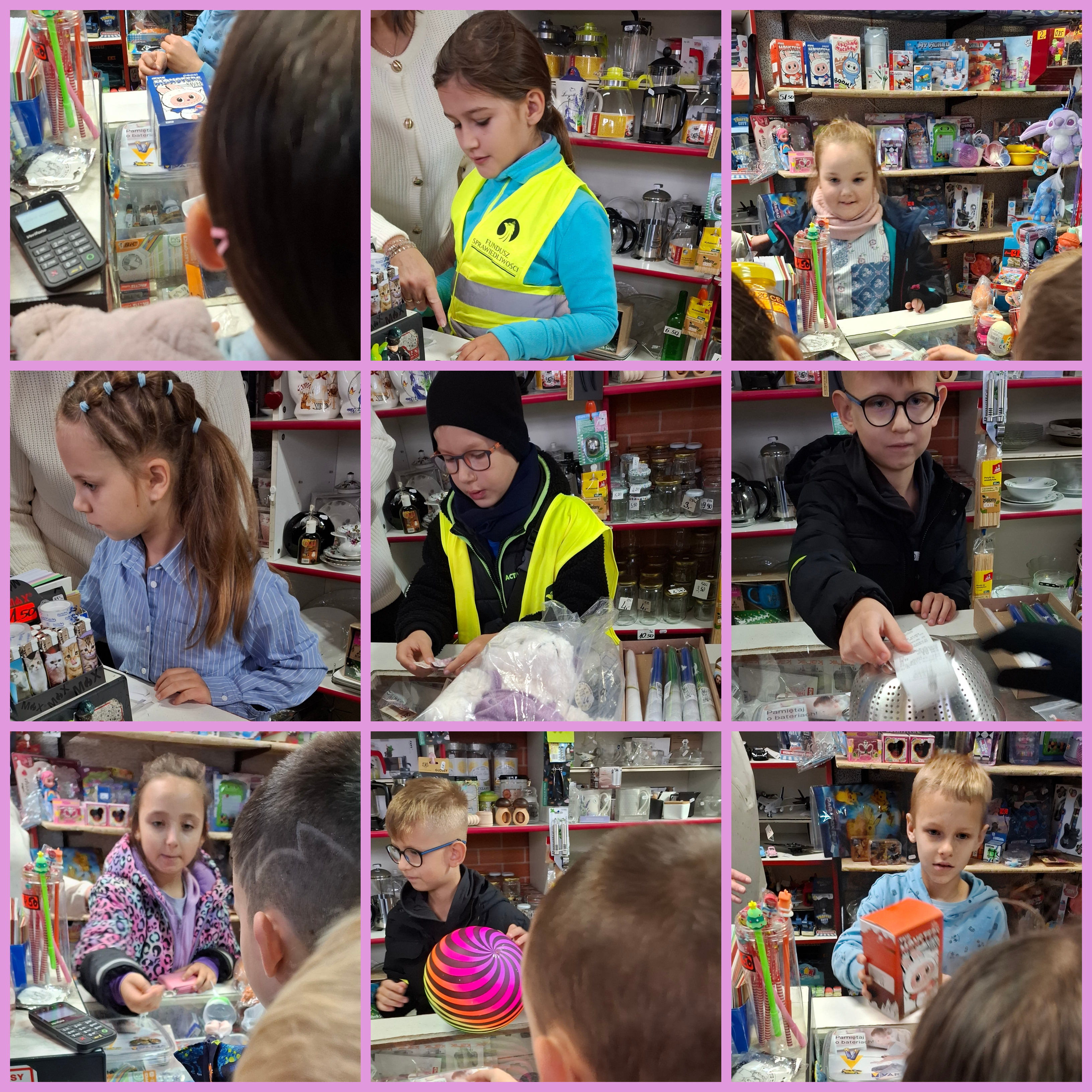 W dniach 20 i 21 listopada uczniowie klas:1a i 2b odwiedzili osiedlowy sklep AGD. Pani Ania Kowolik, właścicielka sklepu, powitała swoich gości zaraz w progu. Specjalnie dla nich swój wielobranżowy sklep otworzyła już o godzinie 8.00. Cierpliwie odpowiadając na szereg pytań przybliżyła uczestnikom spotkania specyfikę swojej pracy. Dzieci dowiedziały się również na czym polega praca ekspedientki i dostawcy towaru. Pani Ania wtajemniczyła  uczniów także w działania związaną z prowadzeniem biznesu oraz przybliżyła temat drogi edukacyjnej, którą trzeba przebyć, by wykonywać pracę sprzedawczyni. Na miejscu, przy wsparciu właścicielki sklepu i sympatycznej Pani Zosi, jednej z zatrudnionych w sklepie osób, dzieci miały okazję wcielić się w jedną z ich ról. Same sprzedawały towar ze sklepowych półek, nie tylko koleżankom i kolegom, ale i zaglądającym do sklepu klientom.