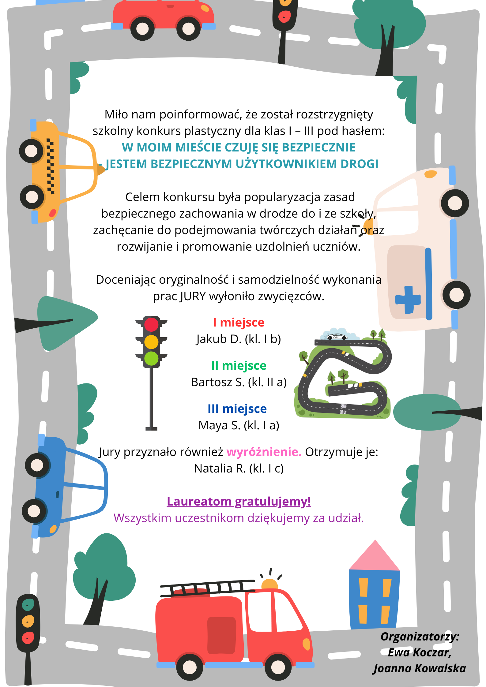 Wyniki konkursu dla klas 1-3 - W moim mieście czuję się bezpiecznie - jestem bezpiecznym użytkownikiem drogi.